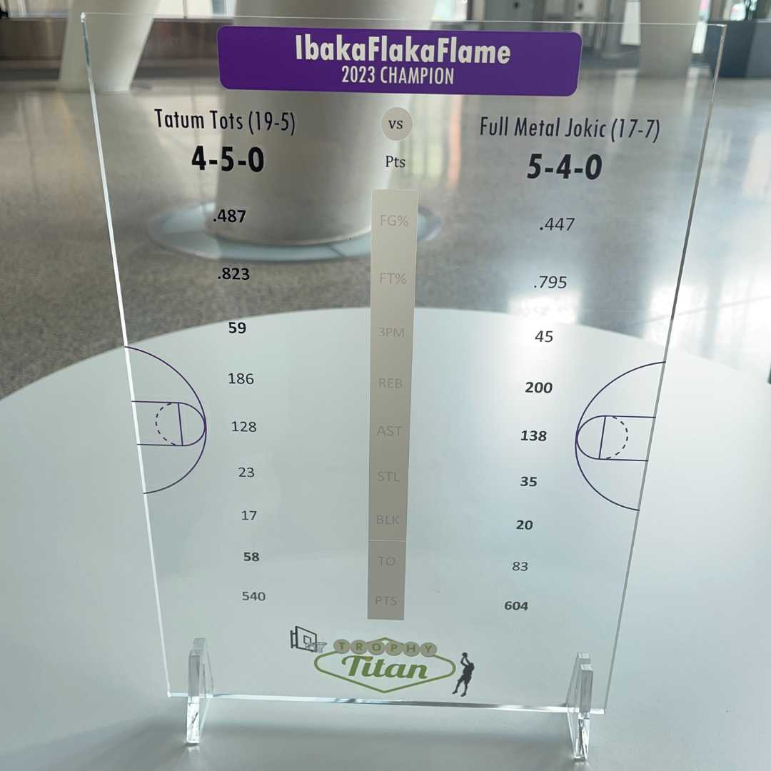 Elevate your fantasy victory with our exclusive Fantasy Basketball Trophy, tailored to commemorate your championship triumph. Our fully customizable trophy showcases every detail, including head-to-head category stats, league name, team name, record, and the score of the championship matchup.